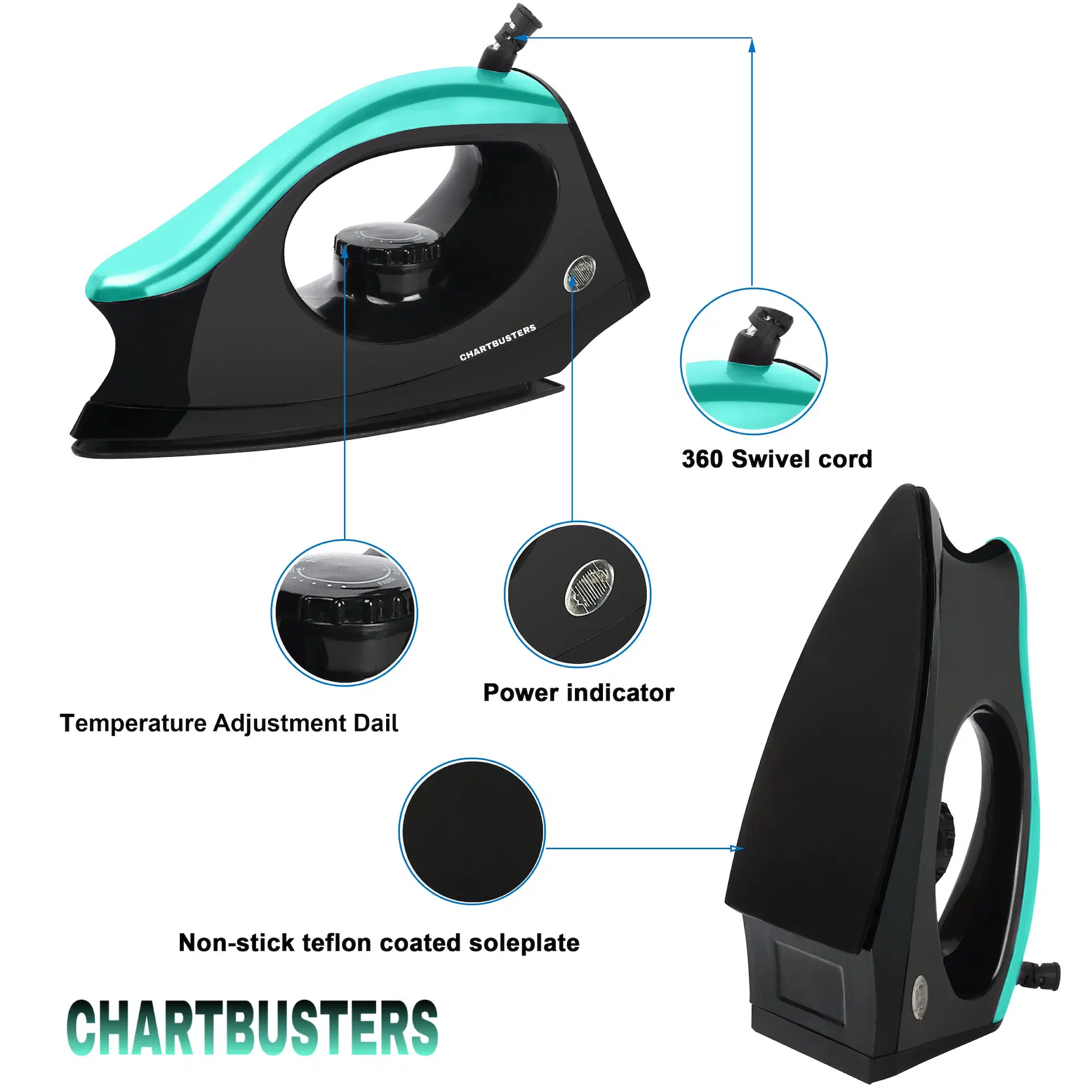 CHARTBUSTERS Keep your clothes looking new with this Non-stick Compact dry iron . Its Coating Plate ensures a smooth gliding experience while the well-designed grip handle ensures a secure and comfortable grip.
