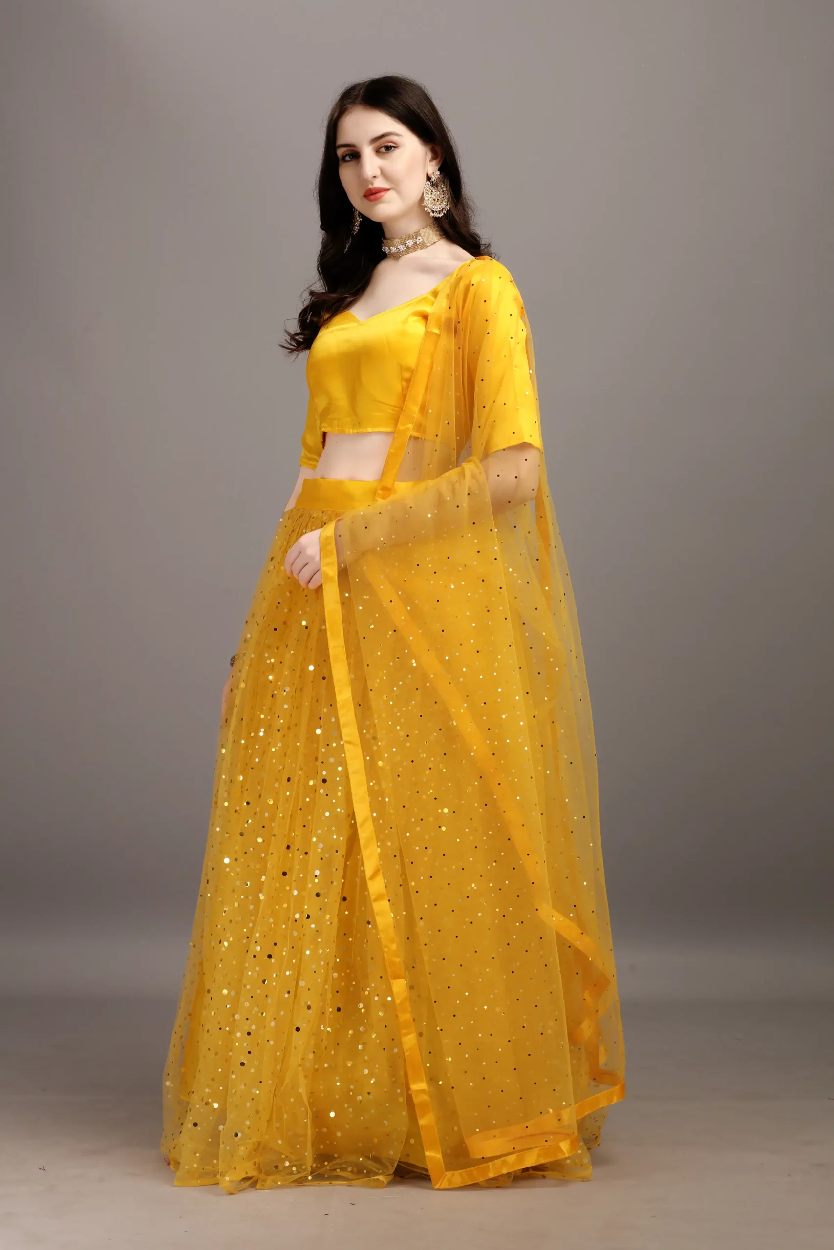 color bucket Yellow Net Circular Semi Stitched Lehenga Single