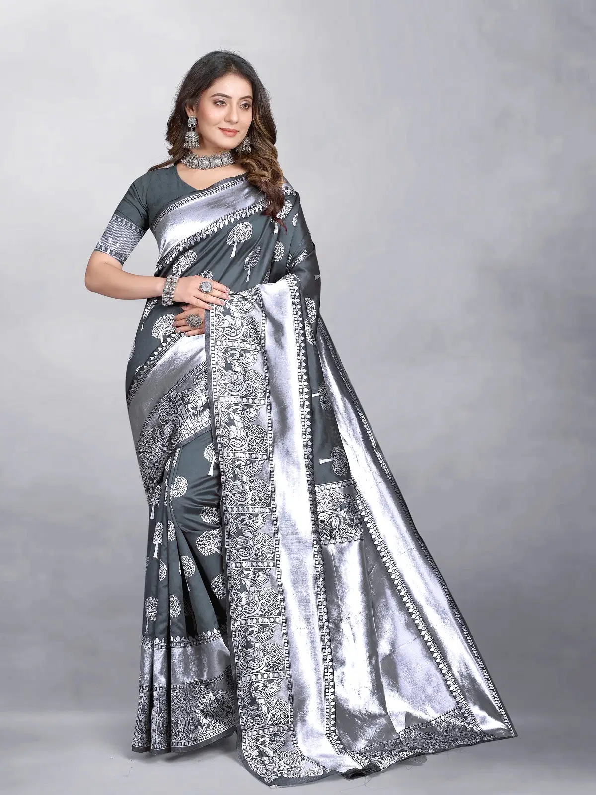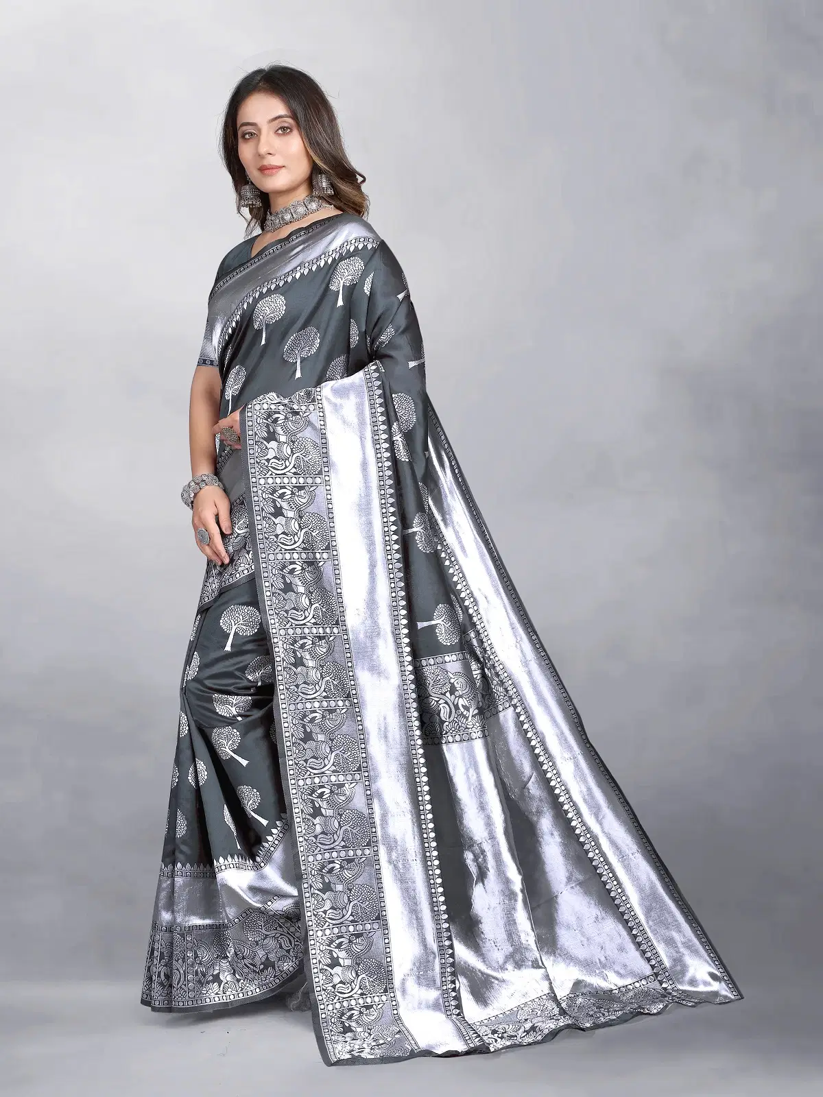 Gazal Fashions Banarasi Silk Embellished Saree With Unstitched Blouse Piece ( Grey )