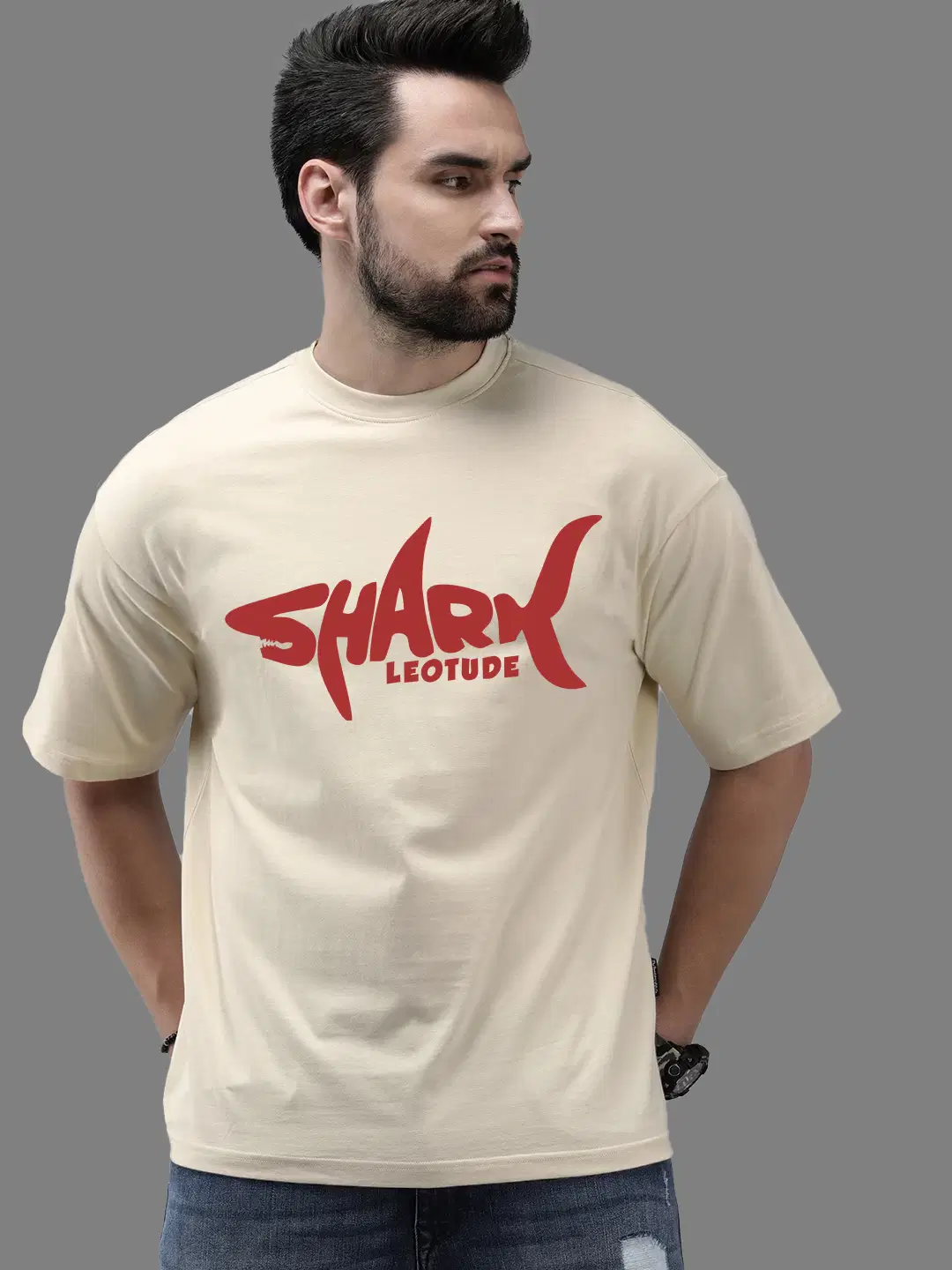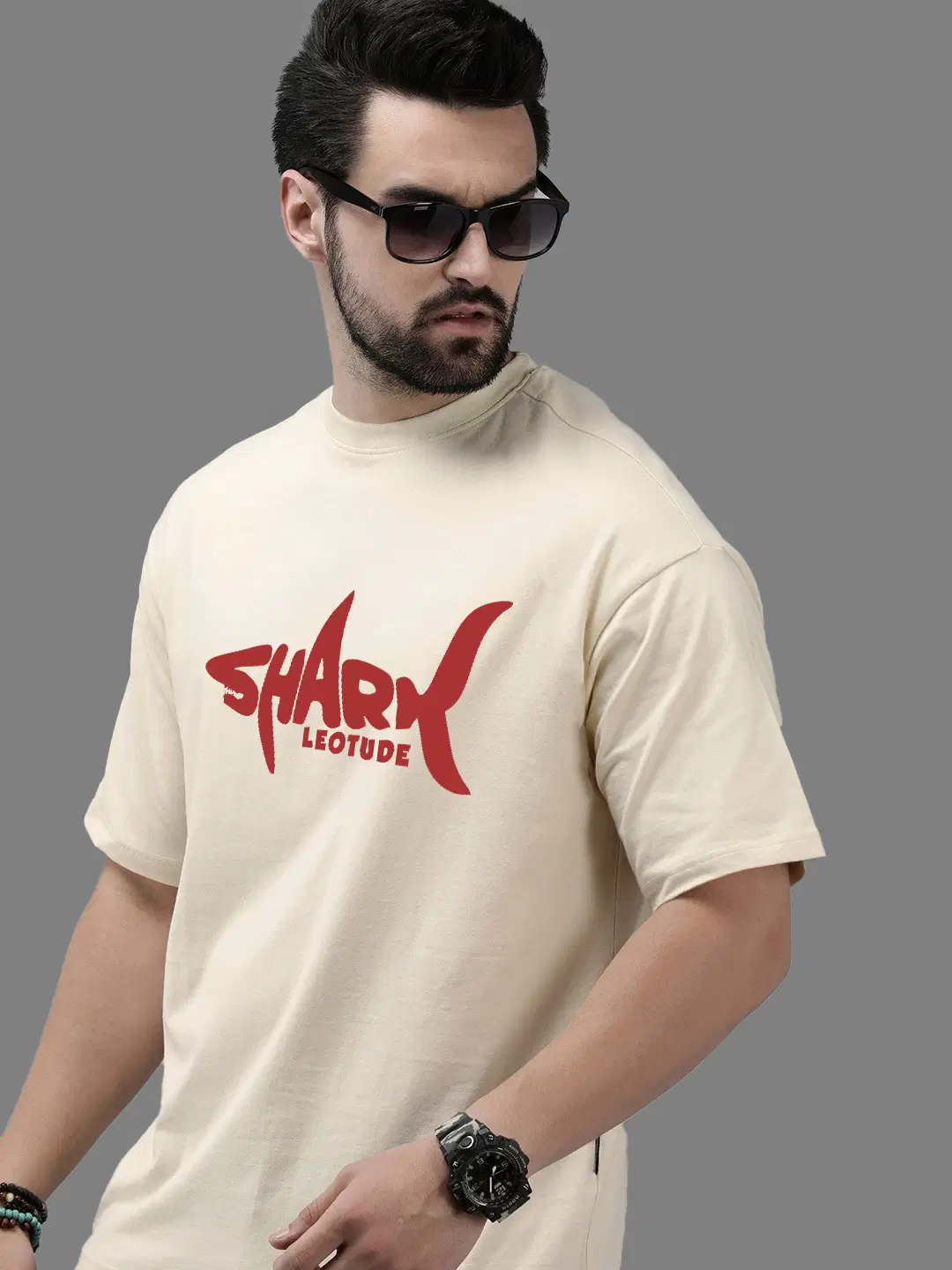Leotude Men Cotton Blend Oversized Fit Printed T-Shirt ( Beige )